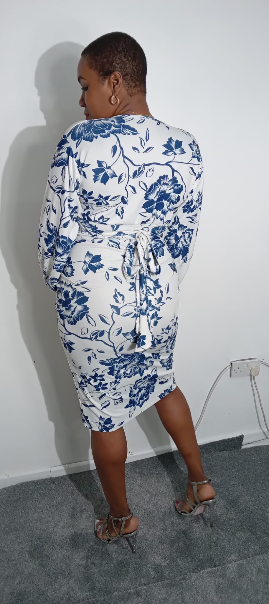 Blue and white floral dress with front split and long sleeves with waist belt. Dress has stretch to it. By Boo Hoo