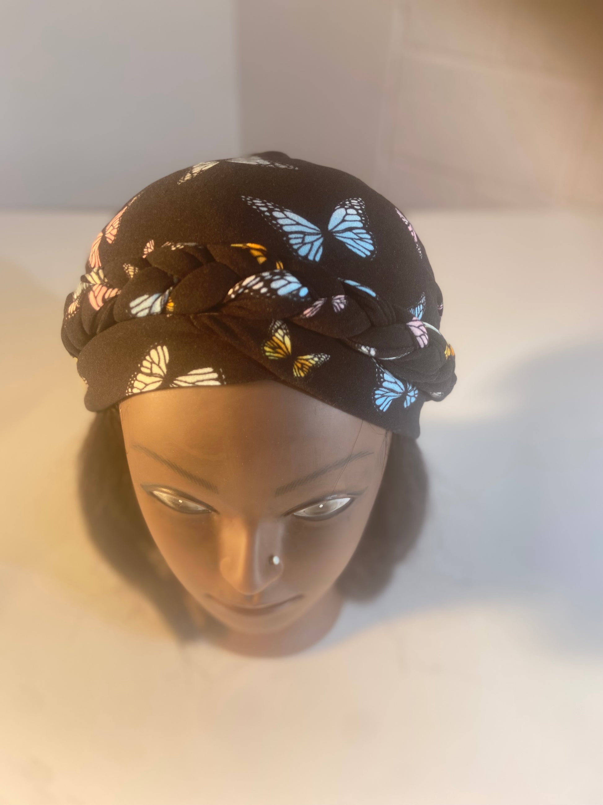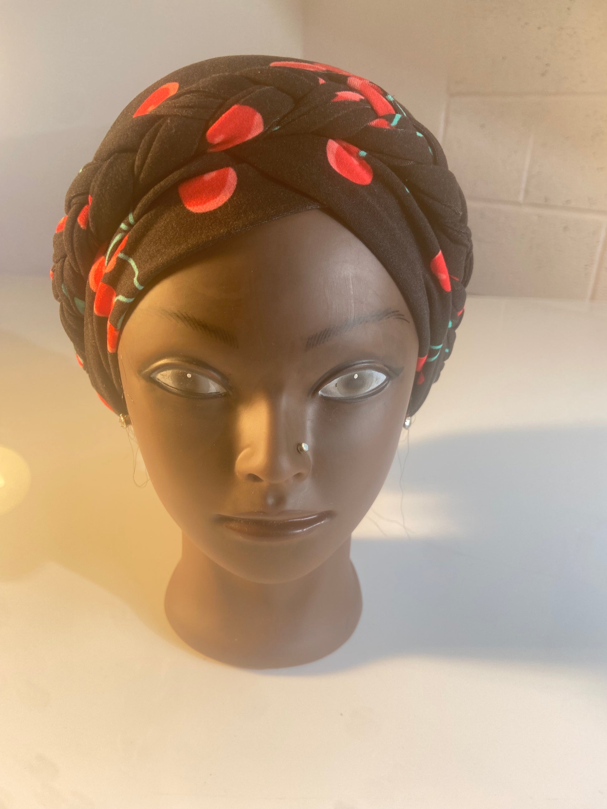 Beautiful bohemian headwear turban hair covering with flower design. Can be worn over short or longer hair.