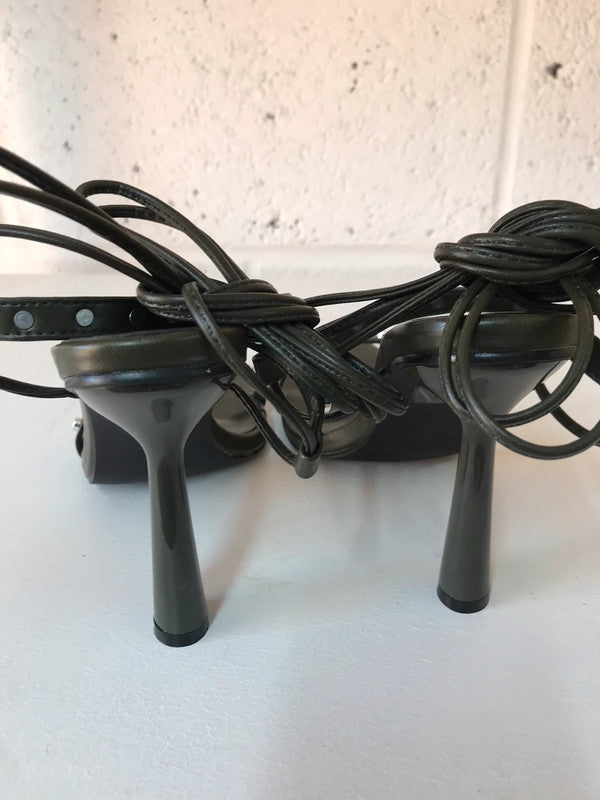 Khaki green Oasis shoes with studs with straps that tie around the ankle and lower leg.