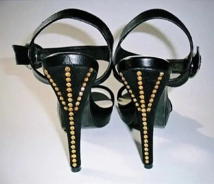 Rosie Mears shoes are something to die for. These beauties are made with a buckle that details beautiful orange crystals. The back heel of the platform sandals is detailed with more beautiful orange crystals. The gorgeous sandal could definitely be styled with a black cocktail dress or any business attire you desire. Color- Black Heel - 4 inches in height. The back heel is detailed with orange crystals. Material- Authentic Leather
